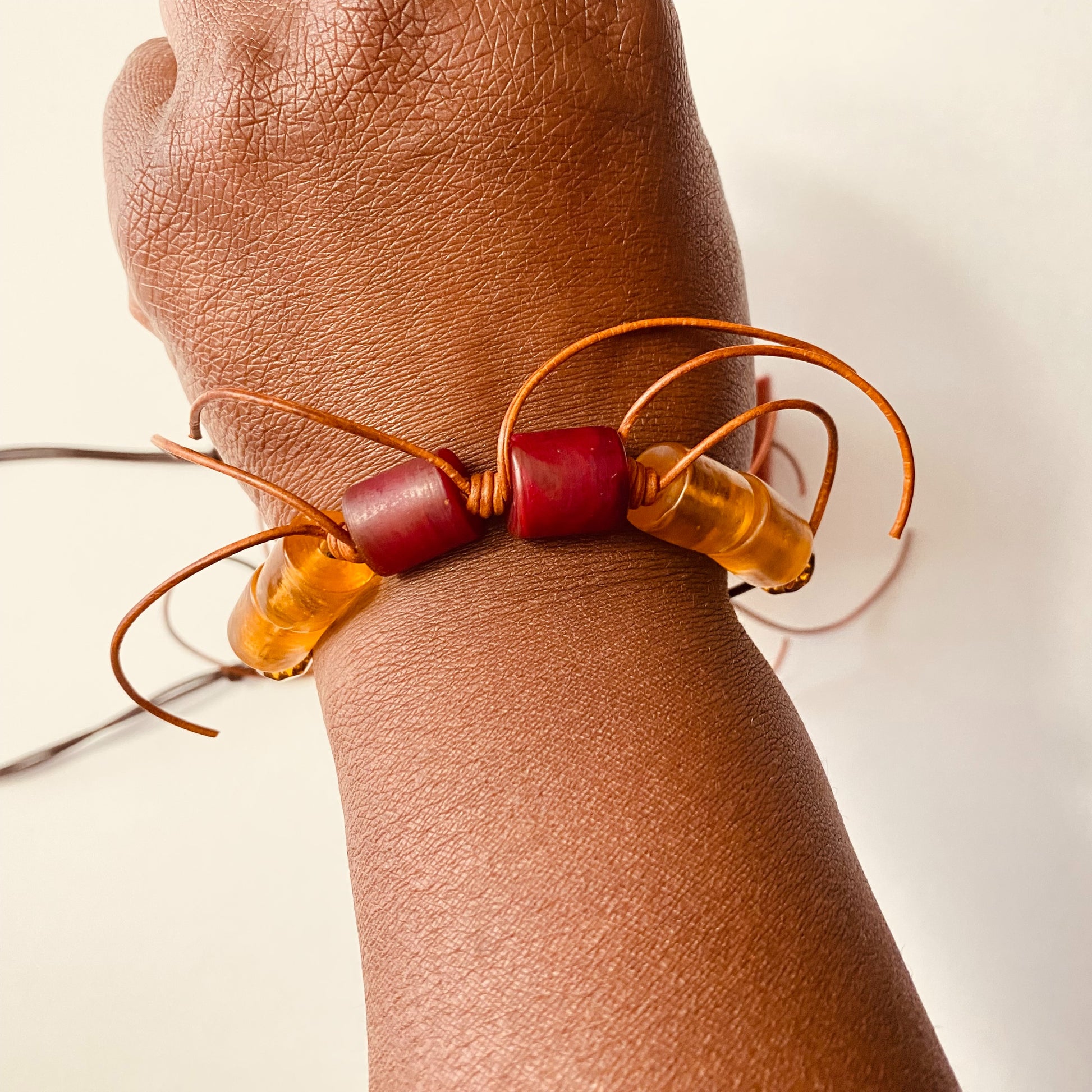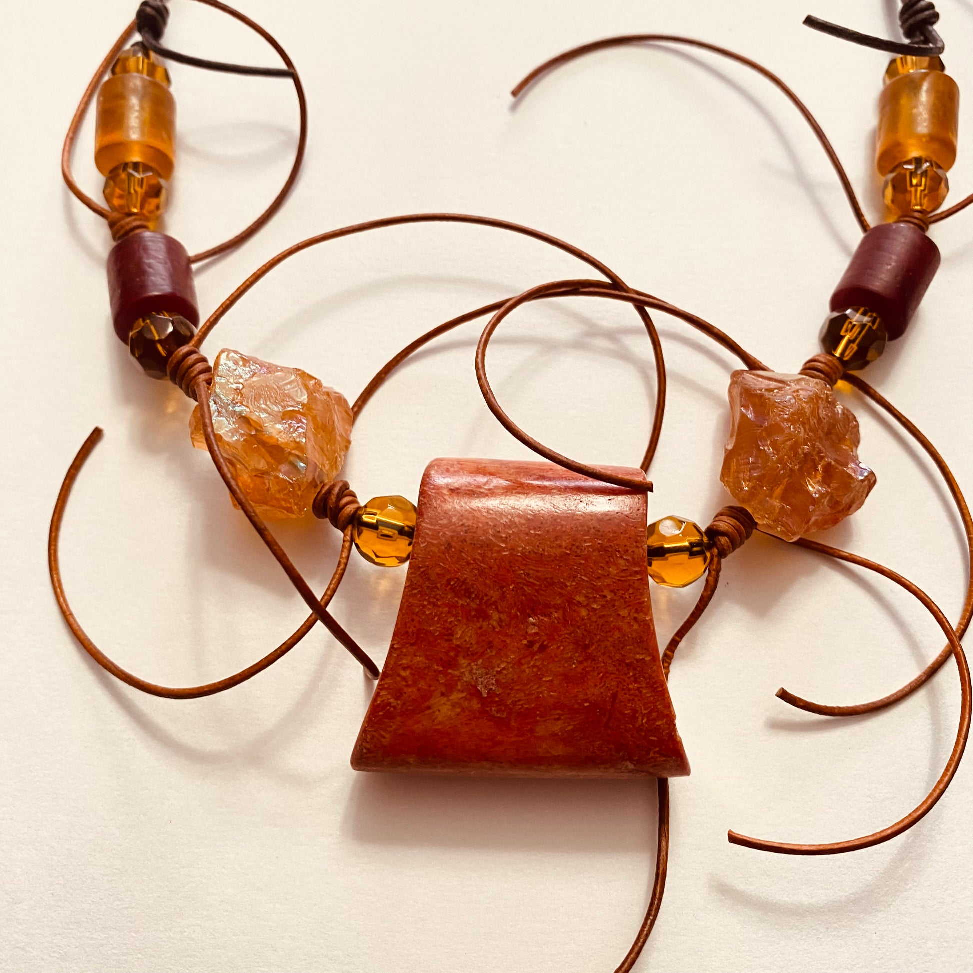 This three-piece set begins with an orange focal bead accented with amber quartz, burgundy, and amber glass beads forming the necklace. (The accents remind us of rock candy.) It is strung with a dark brown 2mm leather cord. The loose ends are made with tan 2mm leather barrel knots. The loose ends remind us of ease and flow freely.
