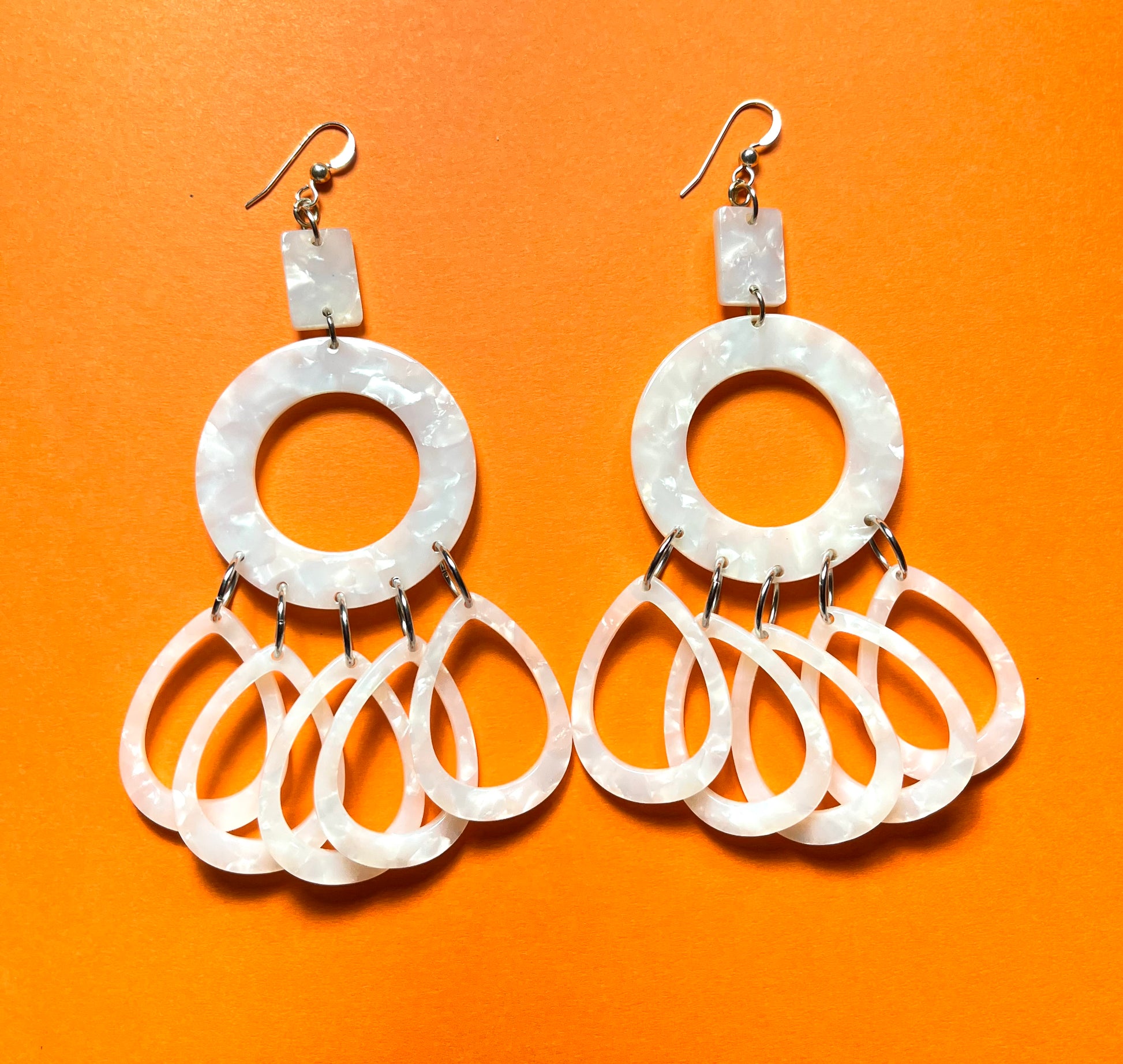 Dangling a chalky pearl white small rectangle, a donut shape with five hanging teardrop beads.